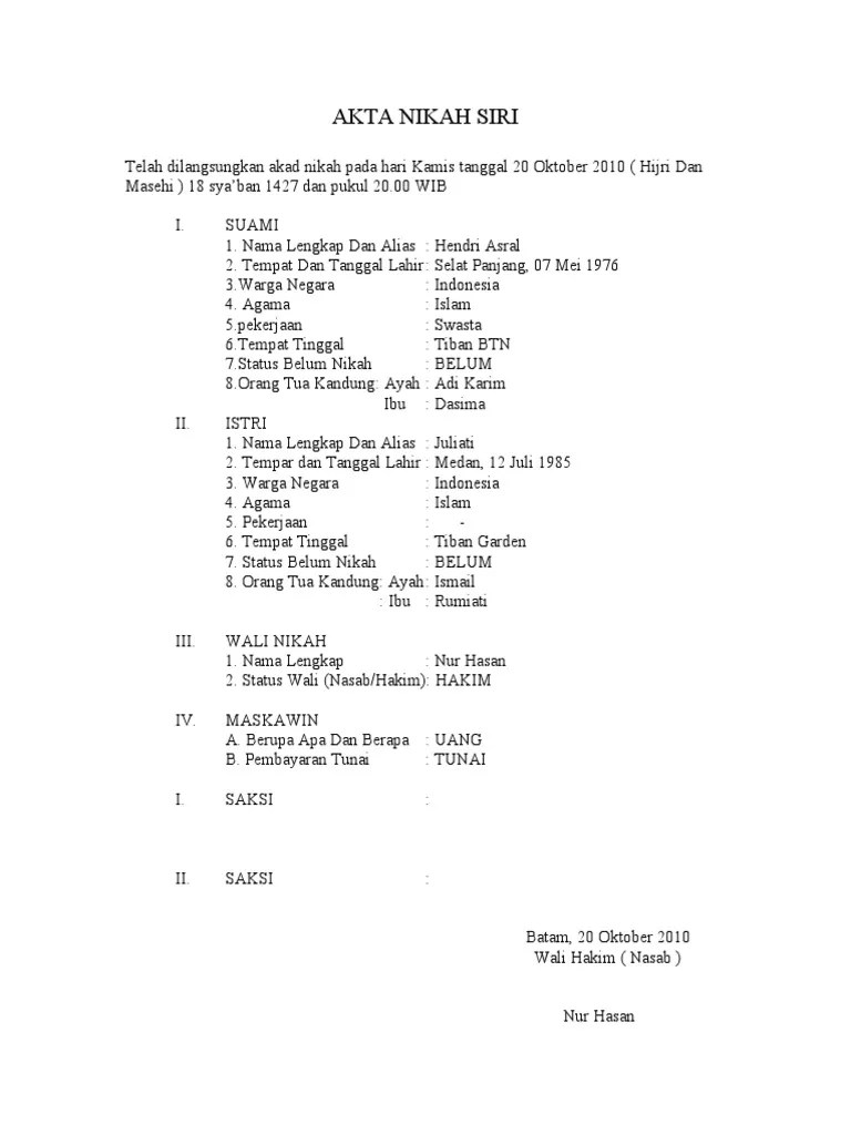 Makalah agama islam nikah siri. Unduh sebagai docx, pdf, txt atau baca online dari scribd. Yuk, simak contoh surat nikah siri berikut agar diakui negara! Saya yang bertanya ditangan dibawah ini : This document was uploaded by user . Pada dasarnya, sebuah pernikahan haruslah diakui secara agama dan juga secara hukum.